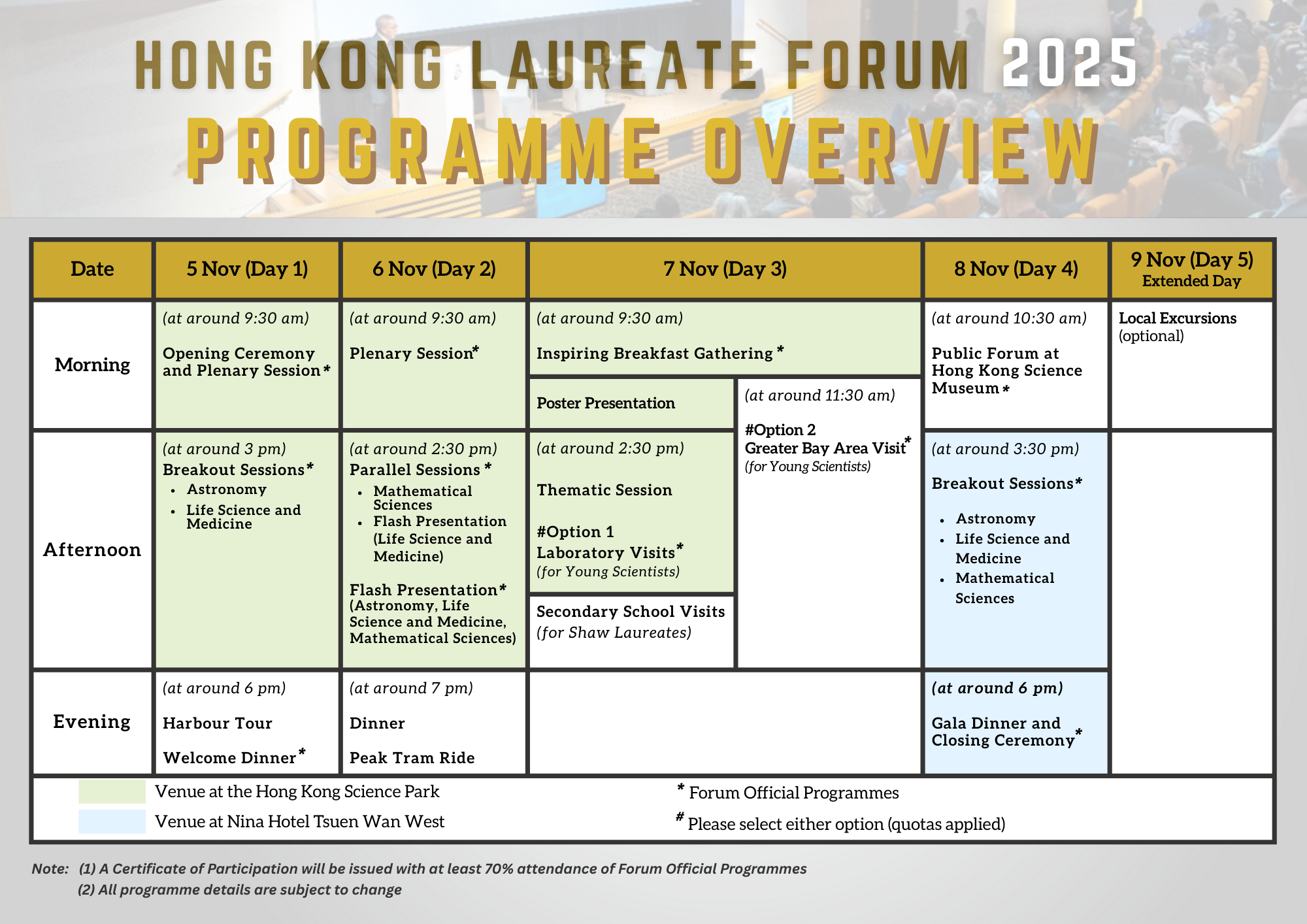 The 2nd Hong Kong Laureate Forum will take place on 5-8 November 2025. Shaw Laureates and distinguished scientists will spend 4 days in Hong Kong interacting with 200 young scientists from around the world, sharing their views, experience and aspirations in various scientific fields. The programme consists of world-class intellectual seminars, discussion groups, workshops, poster sessions and visits to the latest Hong Kong scientific development projects, universities and institutes as well as cross-cultural social activities.